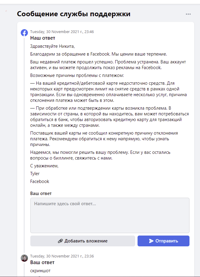Вот мне надо было настроить рекламу, все сделал запустил в РК пишет действующая, ну думаю все норм, но охвата нет, уже неделю пробую разные моменты, но охвата нет, деньги соответственно не снимает. Привязал еще одну карту, копировал компанию, абсолютно новую кампанию создавал - ничего не помогает. В тех поддержку написал "Здравствуйте, с моей карты были списаны деньги, но в личном кабинете написано что произошел сбой, помогите решить проблему,пожалуйста. Надеюсь на ваше содействие!". Ответ: "Ваш недавний платеж прошел успешно. Проблема устранена. Ваш аккаунт активен, и вы можете продолжить показ рекламы на Facebook." "Поставщик вашей карты не сообщил конкретную причину отклонения платежа. Рекомендуем обратиться к нему напрямую, чтобы узнать причины.". И это в одном сообщении, что то не понятное для меня.