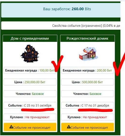 Дом с привидениямиЕжедневная награда : 100,00 битЦена : 250,000.00 битЧленство: БазовоеСобытие : С 25 по 31 октябряКуплено : Не принадлежитСобытие не происходитРождественский домикЕжедневная награда : 200,00 битЦена : 500,000.00 битЧленство: БазовоеСобытие : С 17 по 31 декабряКуплено : Не принадлежитСобытие не происходит