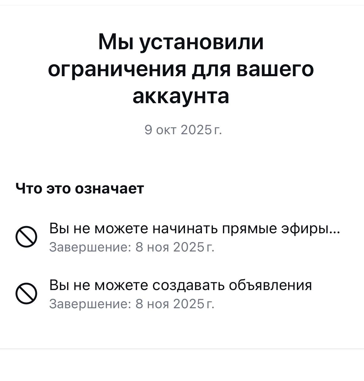 Здравствуйте. На мой инст аккаунт наложили ограничения. В одном месте пишут почти год нельзя вести трансляции. В другом месте написанно что через месяц окончится ограничение. Где правда? Я уже подал жалобу в верховную инстанции, потому что мое видео ничего не нарушало, но это уже другой вопрос